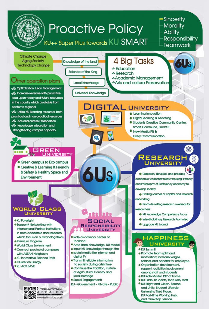 มหาวิทยาลัยเกษตรศาสตร์กำลังก้าวเข้าสู่ยุคใหม่ โดยมีพันธกิจในการสร้าง “ศาสตร์แห่งแผ่นดิน” เพื่อความเป็นอยู่ที่ดีของประเทศไทยและประเทศอื่น ๆ เพื่อบรรลุเป้าหมายนี้ มหาวิทยาลัยจึงได้ริเริ่ม นโยบาย “6Us” แบบรุก เพื่อยกระดับ KU ให้เป็นสถานที่ที่ดีขึ้นสำหรับการเรียนรู้และการวิจัยชั้นนำในลักษณะที่ยั่งยืน